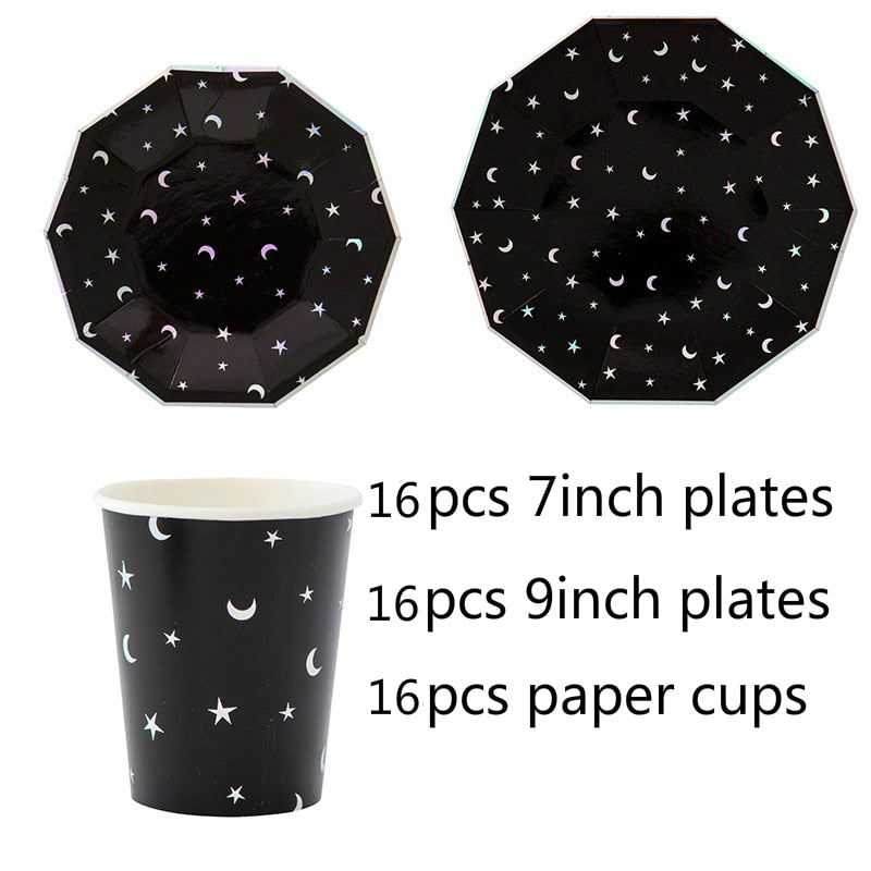 48pcs Black Moon Silver Foil Gilded Paper Plate Cup Napkin Party Tableware High Quality Birthday Bridal Party Decoration LUHONG