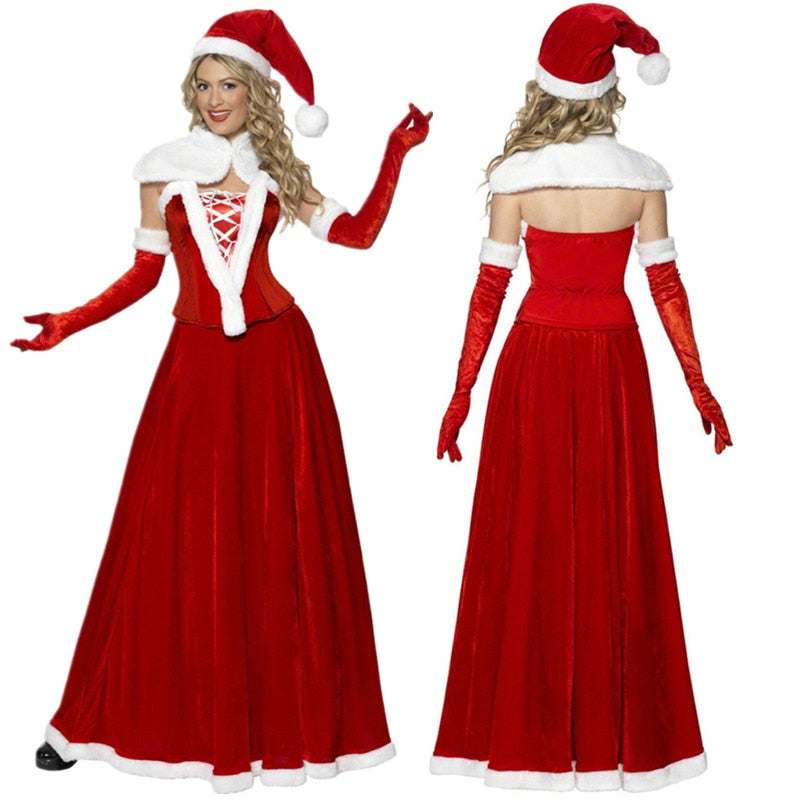 5Pcs/Set Adult Christmas Party Women Santa Claus Costume Red Velvet XMAS Dress Christmas Holiday Long Dress