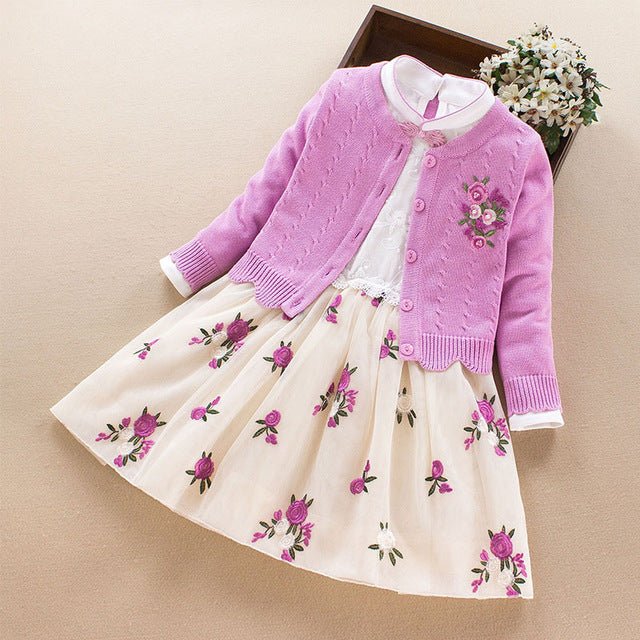 Children`s Winter Clothes Set Girls Sweater Coats+lace Dresses 2pcs Suit Girls Princess School Clothing Kids Christmas Clothes